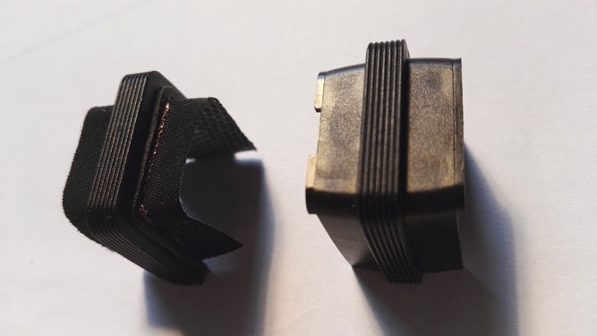 Úprava prostředních plastových dílů motorových souprav Desiro (Tillig) imitujících "harmoniku", která spojuje obě části soupravy. Tyto díly velice často způsobovaly vykolejování soupravy při průjezdu oblouků o malém poloměru R267 či R310 a následném rovném úseku, kdy vadily vozům ve vyrovnání. Na obrázku je znázorněn díl před úpravou a po úpravě, která spočívala v odstranění části plastového dílu z obou stran tak, aby u "harmoniky" zbylo cca 1,5-2mm. Poté byla do zbylé části vlepena černá látka o rozměrech 17x50mm. Tato látka jednak pracuje s větší vůlí mezi ní a kapotou a pak si v obloucích lépe vyhoví.