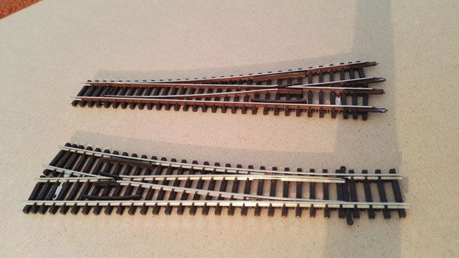 Patinování výhybek viditelné části kolejiště je nejlépe provést ještě před samotným nalepením a to z důvodu mnohem lepší manipulace. Nejprve je nutná úprava výhybky spočívající v elektrickém propojení jazyků a opornic, neboť po patinaci může barva znemožnit přenos elektrického proudu. Navíc samotné letování by později mohlo teplem poškodit povrchovou úpravu. Rovněž je lépe provést i důkladnou kontrolu originálních propojek a jejich případnou opravu. Z poloviny jsou z výroby špatně přibodovány!!! Dále pak je dobré proletovat srdcovky, které výhybku zpevní a vytvořit pájecí body zespodu paty kolejnic. Samotné rychlé naletování vodičů už povrchovou úpravu neponičí. Pomyslnou třešničkou dokonalosti je pak odstranění přebytečných výlisků určených k uchycení elmg.přestavníku a bočního vedení mechanismu přehazování výhybky a ponechání pouze jednoho otvoru pro vodící drátek.