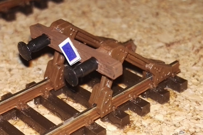 Šturc jsem chtěl mít co nejvíc podobný české předloze, tak jsem jej opatřil dvěma kovovými nárazníky (jistě mohou být jakékoliv jiné), které jsem po vyvrtání dvou 2mm děr vsunul do příčného pražce (součást stavebnice). Tento příčný pražec jsem pak slepil s dvěma stojnami a celý šturc v poslední fázi obarvil (rez a černá). Mezi nárazníky jsem jako třešinku na dortík nalepil návěst "Posun zakázán".